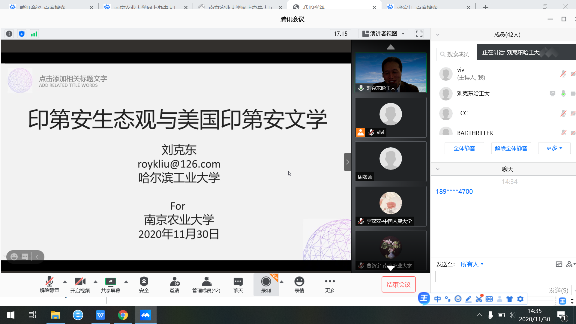 2020年11月30日下午,哈尔滨工业大学3003新葡的京集团网址教授、硕士生导师、澳大利亚研究中心主任刘克东应3003新葡的京集团网址邀请,通过腾讯会议平台为新葡的京官网师生作了题为“印第安生态观与美国印第安文学”的学术讲座。讲座由副院长(主持工作)曹新宇主持,新葡的京官网部分教师和学生以及来自全国多所高校的学者参加了本次学术讲座。