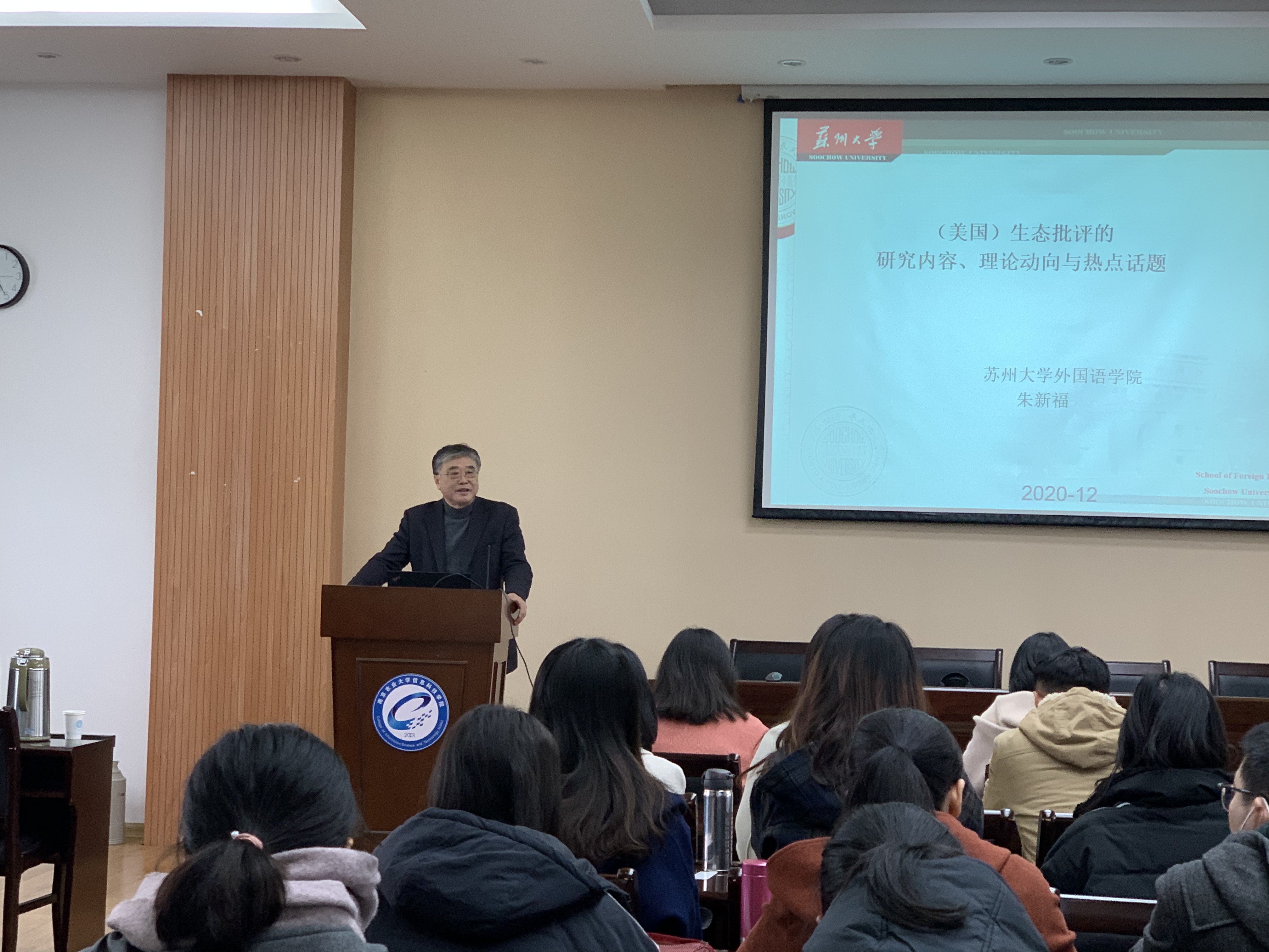2020年12月7日下午,苏州大学3003新葡的京集团网址院长、博士生导师朱新福教授应新葡的京官网邀请,于教学楼七楼报告厅为新葡的京官网师生作题为“(美国)生态批评的研究内容,理论动向与热点话题”的学术讲座。本次讲座由3003新葡的京集团网址副院长(主持工作)曹新宇主持,部分教师和研究生到场聆听。