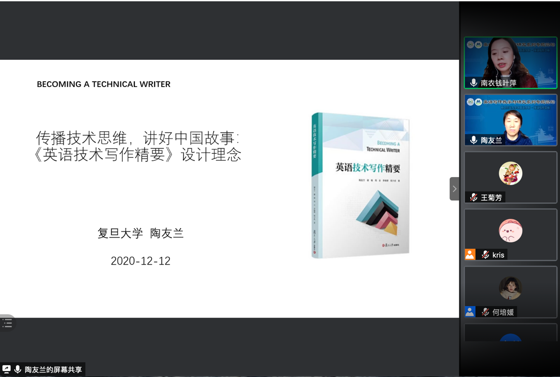 陶友兰教授的报告题为“传播技术思维,讲好中国故事:《英语技术写作精要》设计理念“,陶教授详细介绍了她和合作者们新近出版的技术写作教材。深入浅出地分析了教材中的重点章节和编写理念,同时分享了复旦大学技术写作课程的课堂组织。