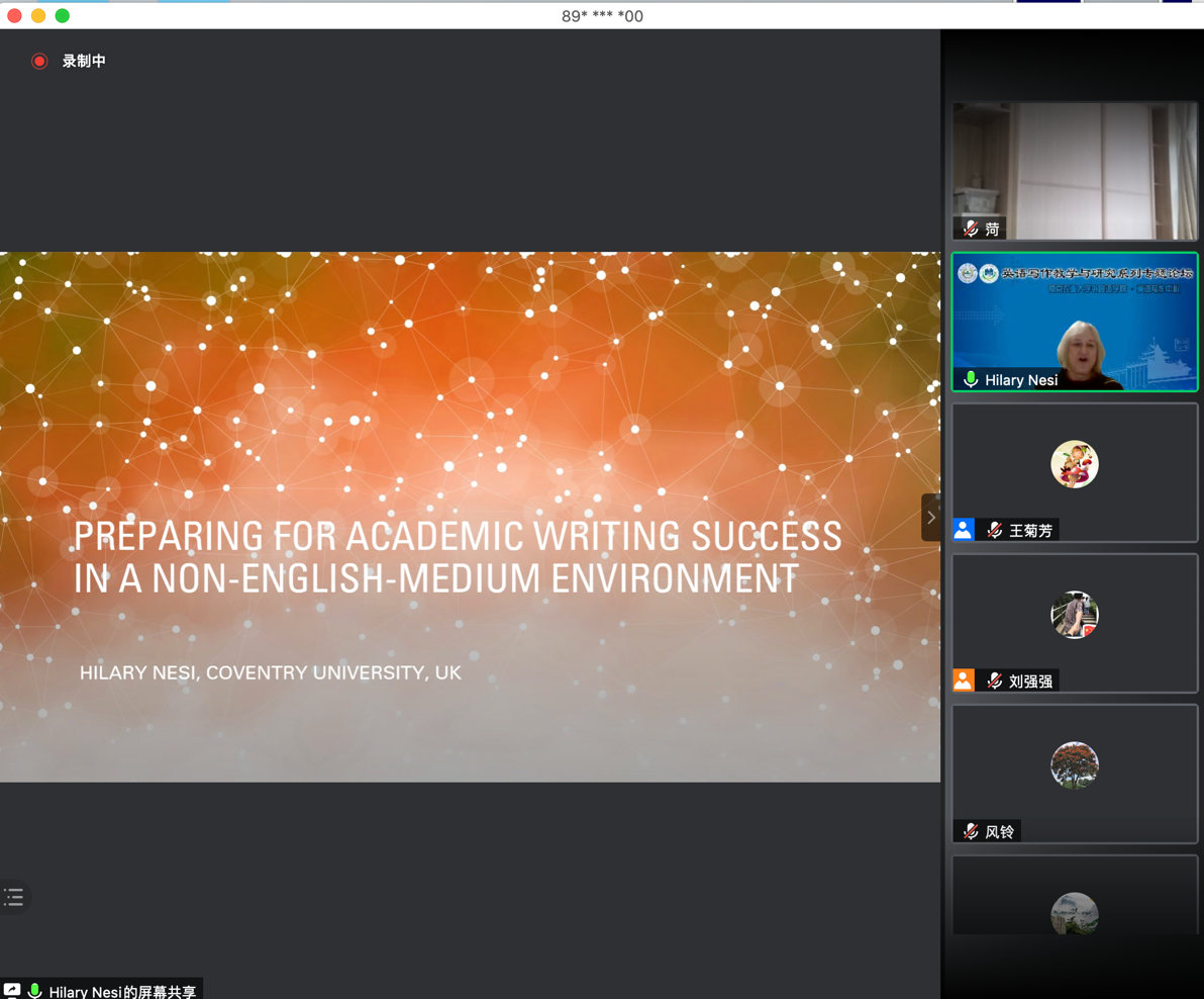 12月13日下午,国内外专家学者再聚云端,系列论坛(三)“学术写作论坛”如约举行。复旦大学蔡基刚教授和英国考文垂大学Hilary Nesi教授分别就学术英语写作教学与研究相关问题做了主旨报告。新葡的京官网学术英语课程组负责人王菊芳老师主持了此次论坛。