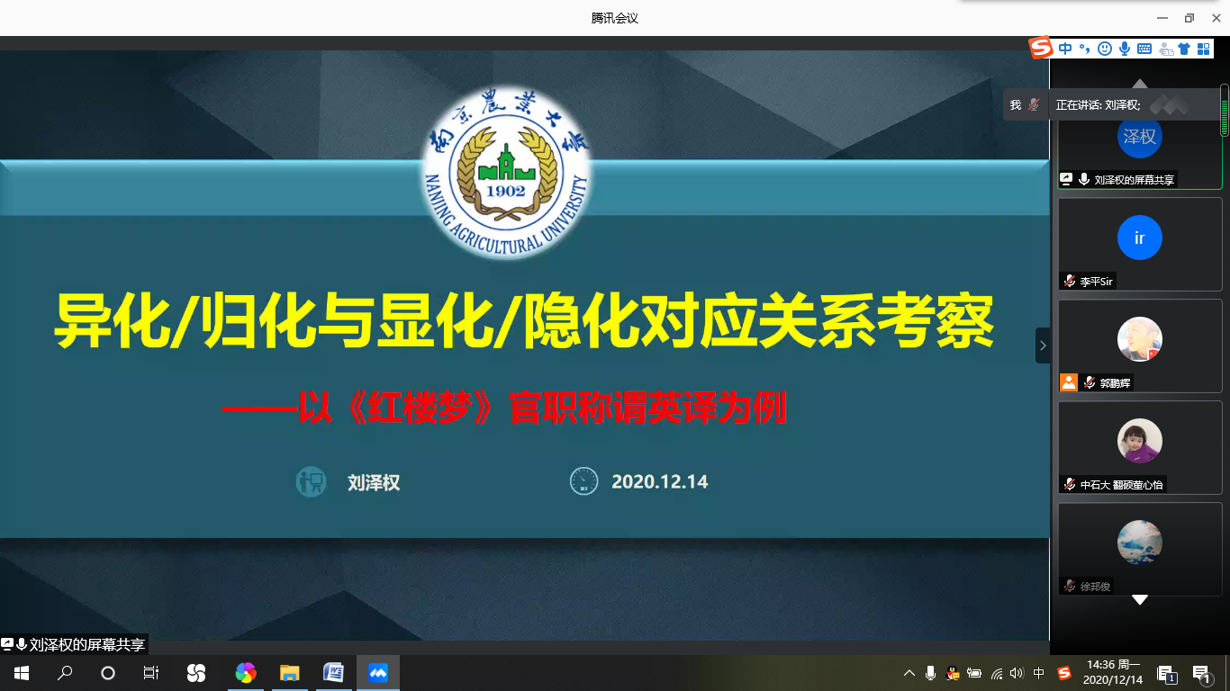12月14日下午2点30分,河南大学3003新葡的京集团网址刘泽权教授应3003新葡的京集团网址邀请,通过腾讯会议平台为新葡的京官网师生做了一场题为“异化/归化与显化/隐化对应关系考察——以《红楼梦》官职称谓英译为例”的专题讲座。此次讲座由3003新葡的京集团网址李平教授主持,新葡的京官网部分师生以及来自全国多所高校的近300位学者参加了本次学术讲座。