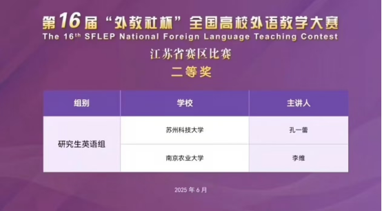 2025年6月7日,第十六届 “外教社杯” 全国高校外语教学大赛江苏赛区获奖名单正式揭晓。新葡的京官网教师李维在首次设立的研究生英语组比赛中表现优异,凭借创新的教学设计与扎实的教学功底斩获佳绩,充分展现了新葡的京官网外语教学的卓越水平与教师队伍的专业素养。