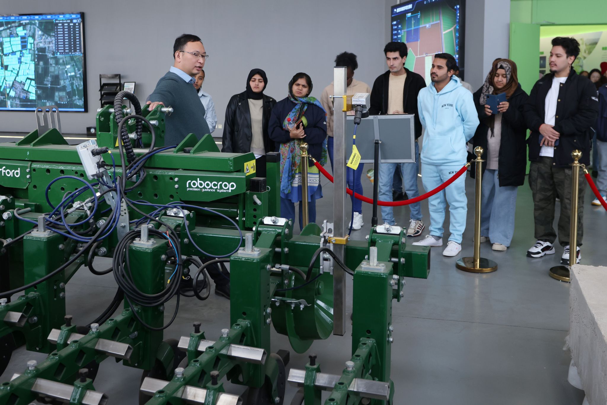 随后,汤亮在研究院展厅讲解了各类智慧农业装备的操作原理与实际成效,包括智慧农作云平台、作物生长监测设备、无人机植保技术等。留学生们纷纷表示,通过实地观摩,他们对中国智慧农业的发展有了更直观、更深刻的理解。互动环节中,现场师生及留学生踊跃提问,气氛热烈。